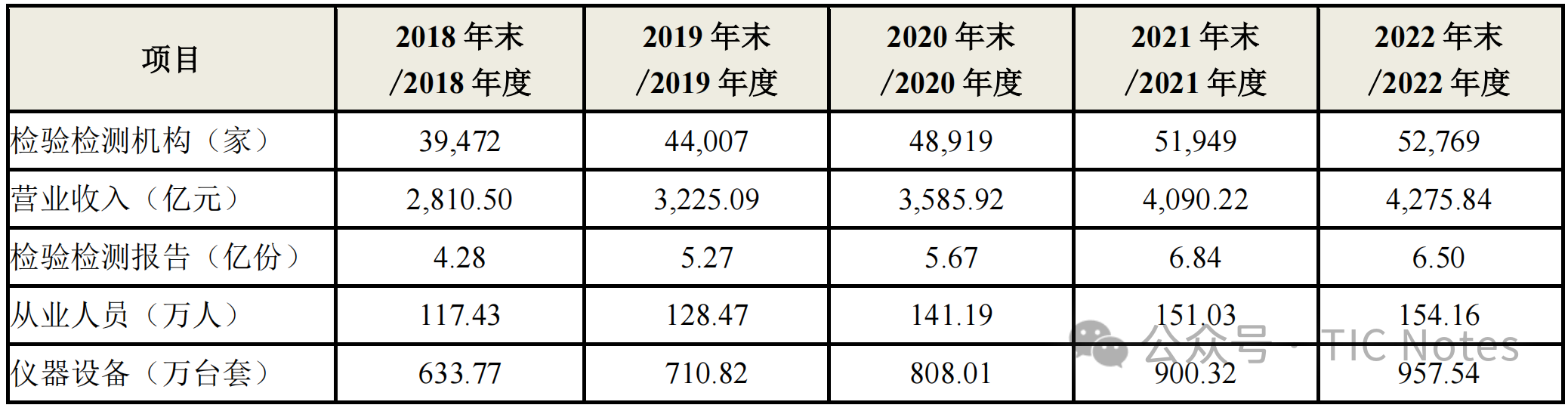 我國檢驗檢測服務業現已覆蓋建筑工程、環保、衛生、農業、質檢、食品、藥品、機械、電子、輕工、紡織、航空等國民經濟各個領域,根據國家市場監督管理總局于 2023 年 6 月發布的《2022 年度全國檢驗檢測服務業統計簡報》(以下簡稱“統計簡報”),我國檢驗檢測行業規模繼續擴大;2022 年末,獲得資質認定的各類檢驗檢測機構 52,769 家,較 2021 年末增長 1.58%;2022 年度實現營業收入 4,275.84 億元,較 2021 年度增長 4.54%;2022 年度共向社會出具檢驗檢測報告 6.50 億份,較 2021 年度下降 4.97% 。