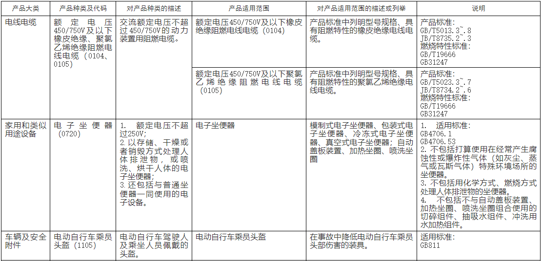 一、對商用燃氣燃燒器具、阻燃電線電纜、電子坐便器、電動自行車乘員頭盔、可燃氣體探測報警產品、水性內墻涂料、防爆燈具及控制裝置實施CCC認證管理(產品描述與界定詳見附件)。