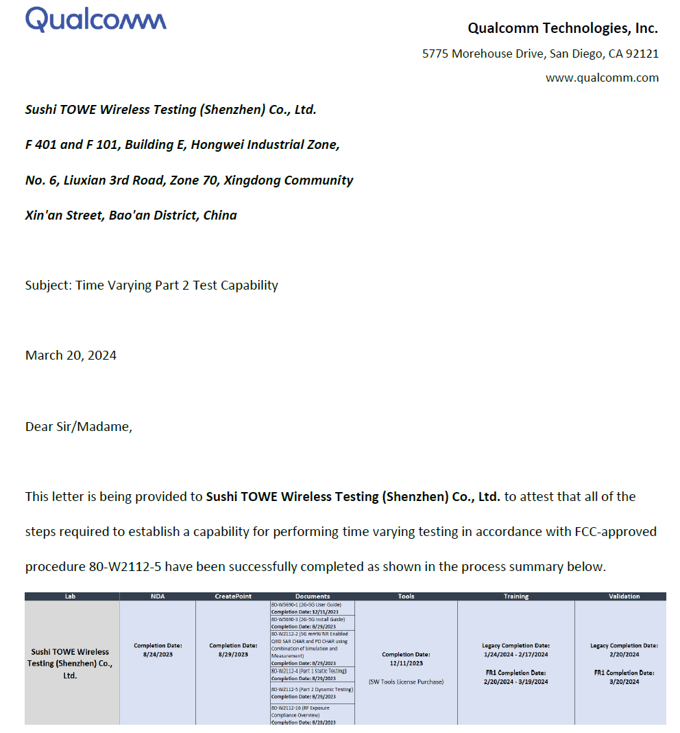 近日,蘇試試驗(yàn)集團(tuán)旗下蘇試拓為無線測(cè)試(深圳)有限公司(以下簡(jiǎn)稱“蘇試拓為”)SAR團(tuán)隊(duì)參加了高通Sub 6G Smart Transmit的培訓(xùn),并按照要求執(zhí)行Sub 6G Smart Transmit 所有的驗(yàn)證項(xiàng)目,最終成功通過審核并獲得高通Sub 6G Smart Transmit的授權(quán)證書。