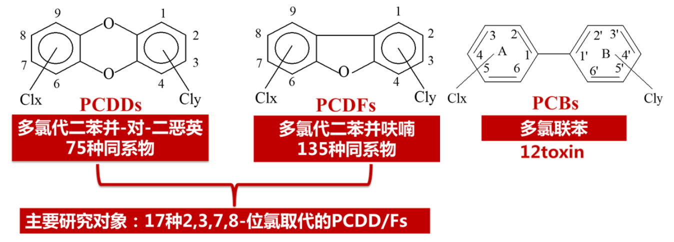 二噁英及其類(lèi)似物是一類(lèi)含有苯環(huán)結(jié)構(gòu)的特定有機(jī)化合物的總稱(chēng),包括多氯代二苯并二噁英(PCDDs)和多氯代二苯并呋喃(PCDFs)和類(lèi)二噁英多氯聯(lián)苯(DL-PCBs)等,具有持久性、生物富集、長(zhǎng)距離遷移和生物毒性等特點(diǎn)。其中以17種2,3,7,8位氯取代的PCDD/Fs和12種DL-PCBs同族體被認(rèn)為對(duì)人類(lèi)和生物危害最嚴(yán)重。