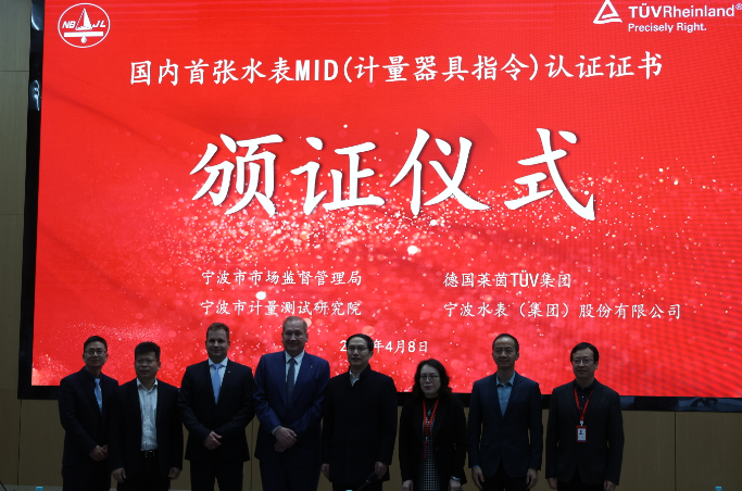 近日,寧波水表科技(集團)股份有限公司在國家水表產品質量檢驗檢測中心(寧波中心)通過德國萊茵TUV認證公司認證,獲得國內頒發的首張MID認證證書。