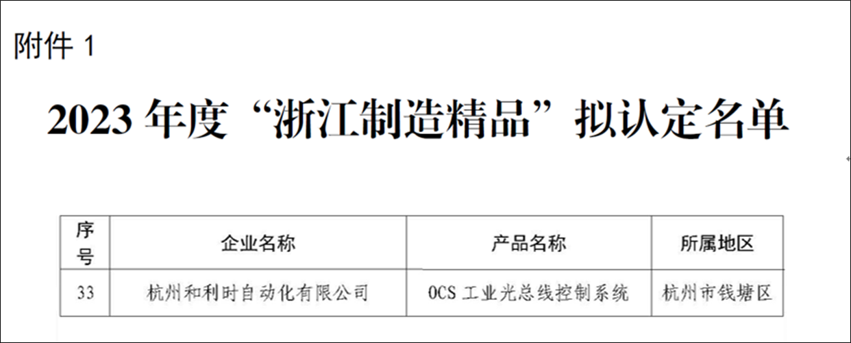 近日,浙江省經濟和信息化廳對2023年度“浙江制造精品”名單進行公示,杭州和利時自動化有限公司申報的“OCS 工業光總線控制系統”榮列其中。