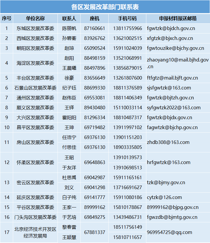 請于5月20日前向區發展改革部門申報(可為項目所在地或項目單位注冊地所在區發展改革部門)。此次項目征集還梳理了各區發展改革部門聯絡員的聯系方式、申報郵箱,歡迎有需要的企業就近就便咨詢政策。