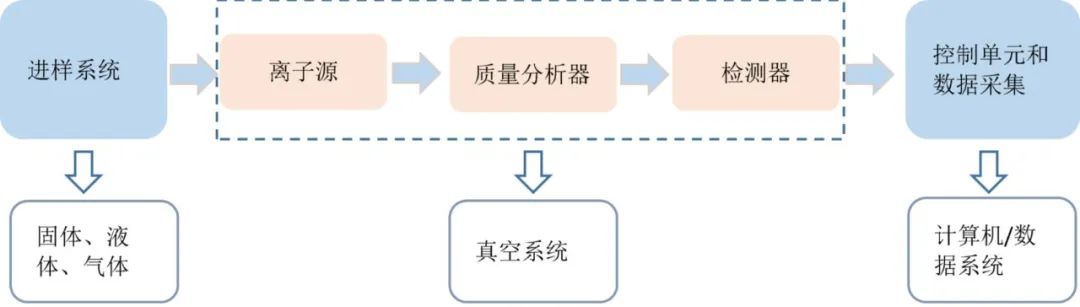 質譜儀器一般由進樣系統(Inlet System)、離子源(Ion Source)、質量分析器(Mass Analyzer)、檢測器(Ion Detector)、計算機系統(Computer)五部分構成(圖1)。分析物通過進樣系統進入到離子源離子化,產生帶電的物質離子,然后進入質量分析器,按照離子的質荷比依次到達離子檢測器進行檢測,最后形成分析物的圖譜[9]。其中,離子源、質量分析器是整臺儀器的核心部件。