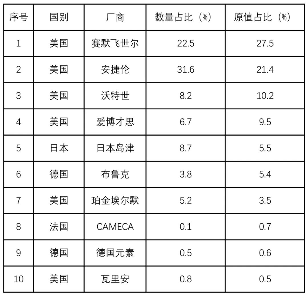 但在核心關鍵技術研發上,渦輪分子泵(真空系統)、光電倍增器、高精密質量分析器以及特殊精密傳感器等核心部件尚未攻克。高端質量分析器領域還存在產品空白。靜電離子阱、傅立葉變換回旋質譜儀、離子淌度四級桿飛行時間串聯質譜、串聯飛行時間質譜、等離子飛行時間質譜聯用等還未實現突破。(表7)
