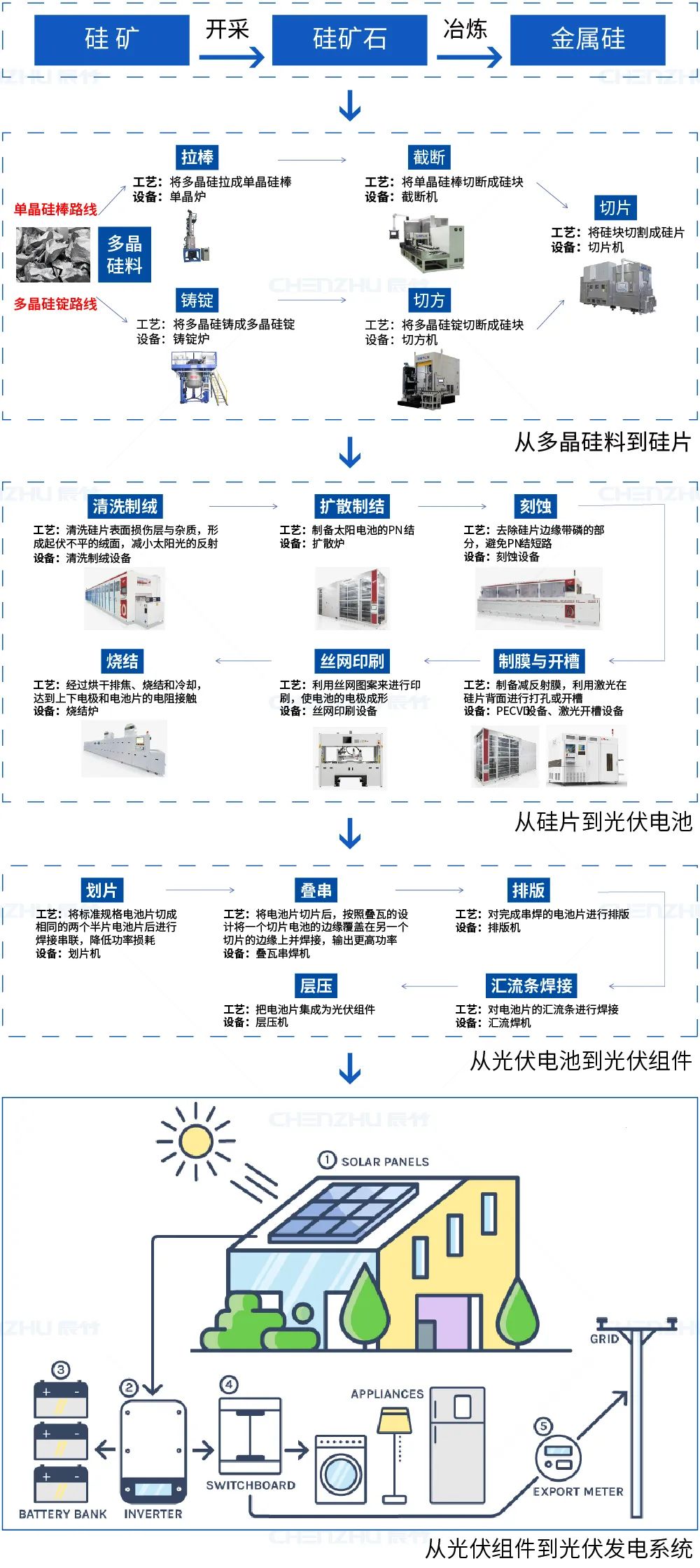 光伏電池板(半導(dǎo)體材料,主要為多晶硅、單晶硅)是光伏系統(tǒng)中主要組成部分,硅片制作是把硅礦石的含硅量不斷提純的過程,從硅片逐步到光伏發(fā)電系統(tǒng)需要多道工序加工完成。