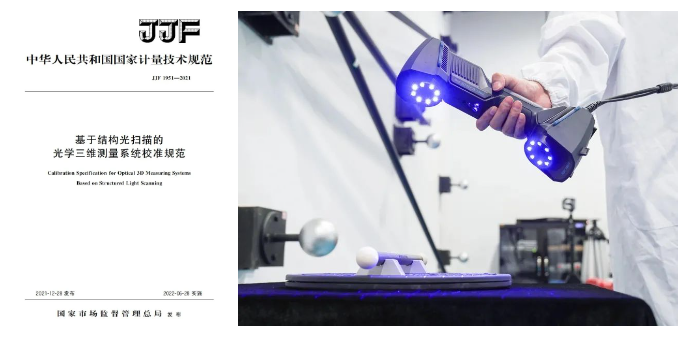 那么三維掃描儀也是一樣,專業(yè)的計(jì)量機(jī)構(gòu),會(huì)按照國家計(jì)量技術(shù)規(guī)范JJF 1951-2021《基于結(jié)構(gòu)光掃描的光學(xué)三維測量系統(tǒng)校準(zhǔn)規(guī)范》來進(jìn)行三維掃描儀的校準(zhǔn)。通俗的理解就是按照統(tǒng)一的操作規(guī)程,來測量可溯源的標(biāo)準(zhǔn)器,通過測量偏差來評(píng)估三維掃描儀的掃描精度。