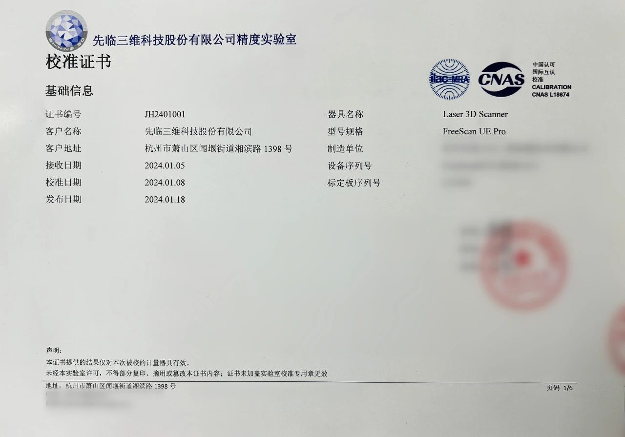 先臨三維打造了通過CNAS認(rèn)可的精度實(shí)驗(yàn)室,實(shí)驗(yàn)室里的測量儀器都是采購于行業(yè)頂級(jí)企業(yè),標(biāo)準(zhǔn)器都經(jīng)過權(quán)威計(jì)量機(jī)構(gòu)可溯源校準(zhǔn)認(rèn)證。