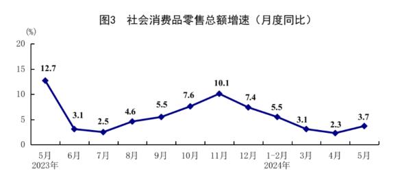 5月份,社會(huì)消費(fèi)品零售總額39211億元,同比增長(zhǎng)3.7%,比上月加快1.4個(gè)百分點(diǎn);環(huán)比增長(zhǎng)0.51%。按經(jīng)營(yíng)單位所在地分,城鎮(zhèn)消費(fèi)品零售額34111億元,同比增長(zhǎng)3.7%;鄉(xiāng)村消費(fèi)品零售額5100億元,增長(zhǎng)4.1%。按消費(fèi)類型分,商品零售34937億元,增長(zhǎng)3.6%;餐飲收入4274億元,增長(zhǎng)5.0%。部分升級(jí)類商品銷售增長(zhǎng)較快,限額以上單位體育、娛樂用品類,化妝品類,通訊器材類,家用電器和音像器材類商品零售額分別增長(zhǎng)20.2%、18.7%、16.6%和12.9%。1-5月份,社會(huì)消費(fèi)品零售總額195237億元,同比增長(zhǎng)4.1%。全國(guó)網(wǎng)上零售額57669億元,同比增長(zhǎng)12.4%。其中,實(shí)物商品網(wǎng)上零售額48280億元,增長(zhǎng)11.5%,占社會(huì)消費(fèi)品零售總額的比重為24.7%。1-5月份,服務(wù)零售額同比增長(zhǎng)7.9%。