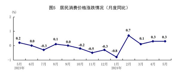 5月份,全國(guó)居民消費(fèi)價(jià)格(CPI)同比上漲0.3%,漲幅與上月持平;環(huán)比下降0.1%。分類別看,食品煙酒價(jià)格同比下降1.0%,衣著價(jià)格上漲1.6%,居住價(jià)格上漲0.2%,生活用品及服務(wù)價(jià)格上漲0.8%,交通通信價(jià)格下降0.2%,教育文化娛樂價(jià)格上漲1.7%,醫(yī)療保健價(jià)格上漲1.5%,其他用品及服務(wù)價(jià)格上漲3.6%。在食品煙酒價(jià)格中,鮮果價(jià)格下降6.7%,糧食價(jià)格上漲0.5%,鮮菜價(jià)格上漲2.3%,豬肉價(jià)格上漲4.6%。扣除食品和能源價(jià)格后的核心CPI同比上漲0.6%。1-5月份,全國(guó)居民消費(fèi)價(jià)格同比上漲0.1%。