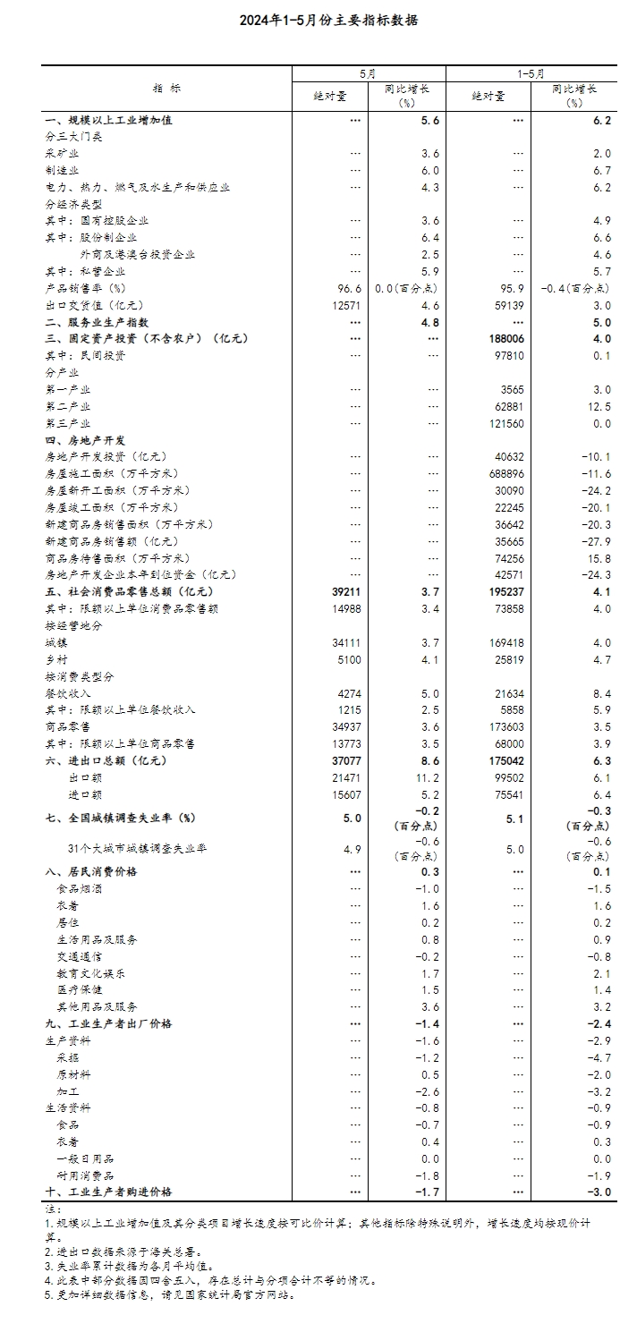 總的來看,5月份,經(jīng)濟(jì)運(yùn)行總體平穩(wěn),主要指標(biāo)有所回升,新動(dòng)能較快成長(zhǎng)。但也要看到,當(dāng)前外部環(huán)境復(fù)雜嚴(yán)峻,國(guó)內(nèi)有效需求依然不足,經(jīng)濟(jì)持續(xù)回升向好仍面臨諸多困難挑戰(zhàn)。下階段,要堅(jiān)持以習(xí)近平新時(shí)代中國(guó)特色社會(huì)主義思想為指導(dǎo),堅(jiān)持穩(wěn)中求進(jìn)工作總基調(diào),完整、準(zhǔn)確、全面貫徹新發(fā)展理念,加快構(gòu)建新發(fā)展格局,著力推動(dòng)高質(zhì)量發(fā)展,靠前發(fā)力有效落實(shí)已經(jīng)確定的宏觀政策,因地制宜發(fā)展新質(zhì)生產(chǎn)力,堅(jiān)定不移深化改革擴(kuò)大開放,鞏固和增強(qiáng)經(jīng)濟(jì)回升向好態(tài)勢(shì),持續(xù)推動(dòng)經(jīng)濟(jì)實(shí)現(xiàn)質(zhì)的有效提升和量的合理增長(zhǎng)。
