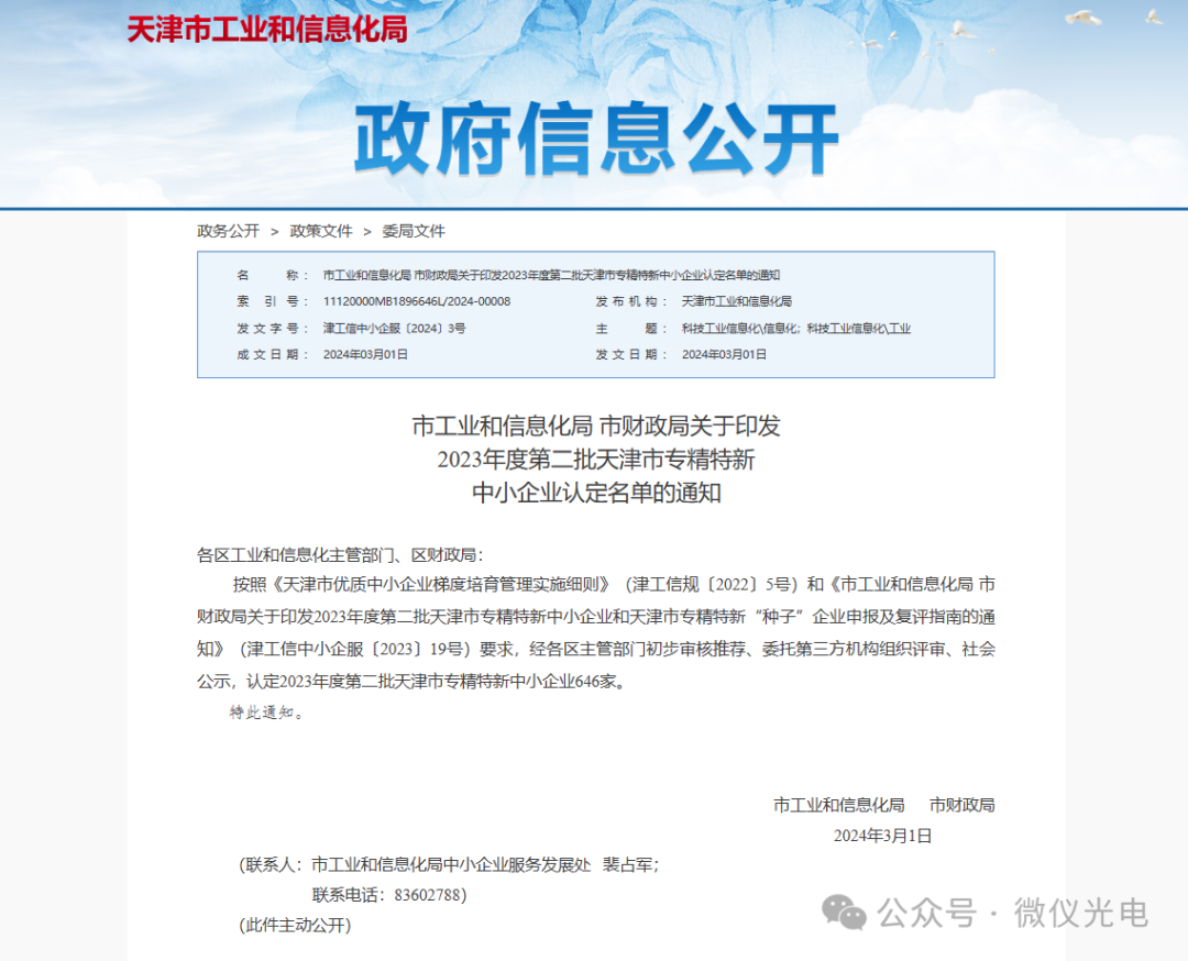 2024年3月1日,天津市工業(yè)和信息化局官方網站發(fā)布了《市工業(yè)和信息化局 市財政局關于印發(fā)2023年度第二批天津市專精特新中小企業(yè)和天津市專精特新“種子”企業(yè)申報及復評指南的通知》,微儀光電(天津)有限公司(以下簡稱“微儀光電”)榜上有名,獲評“專精特新”中小企業(yè)稱號!這是一項非常重要的榮譽,也是我公司多年專注技術創(chuàng)新和不斷提升核心競爭力的成果。