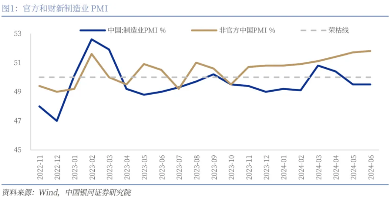 第一,中采PMI和財新PMI統計樣本不同,中采PMI更加綜合,而財新PMI更多反映外向型企業生產經營情況,當前外需整體好于內需,出口保持較高韌性,因此財新PMI持續高于中采PMI。