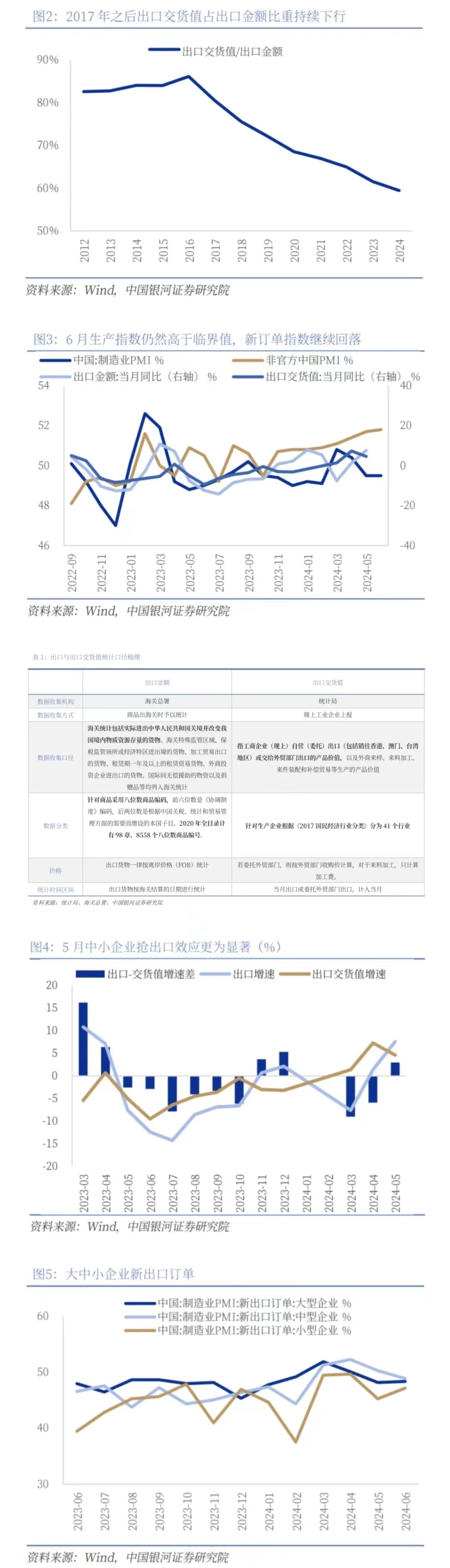 財新PMI更多反映外向型企業的景氣度,出口增速持續改善對應財新PMI的持續擴張。官方和財新PMI調查樣本存在差異:中采PMI的調查樣本涉及《國民經濟行業分類》(GB/T4754-2017)中制造業的31個行業大類,3200家企業,同時在選取樣本時會對增加值較高的行業賦以更高的權重,因此中采PMI抽樣的企業更多是在行中占比較高的大型企業。中采PMI更加綜合,而財新PMI更多反映外向型企業生產經營情況。與之相比,財新制造業PMI統計樣本為650家企業,普遍認為調查樣本主要以沿海地區出口導向型的中小型民營企業及輕工業為主。5月出口金額同比增長7.6%,出口交貨值同比增長4.6%,保持上行趨勢。從2023年11月以來,出口金額增速除了在2024年3月受去年基數影響有負增長,其余月份均保持正增長。當前外需整體好于內需,出口保持較高韌性,因此財新PMI持續高于中采PMI。