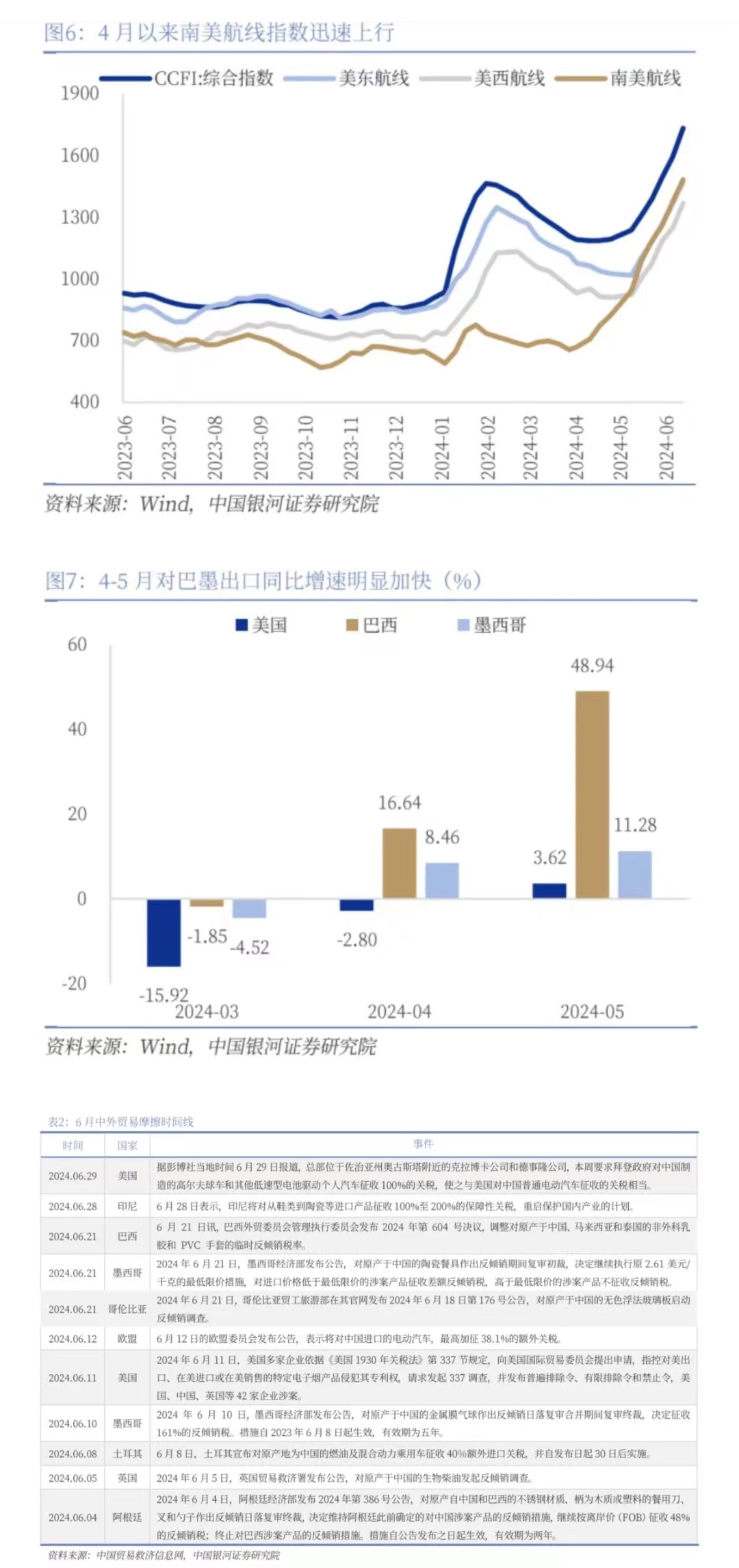 受制于進口國貿易政策的變化和地緣政治的潛在影響,企業出現搶出口行為。5月14日美方發布對華加征301關稅四年期復審結果,進一步提高對自華進口的電動汽車等約180億美元商品加征關稅。6月以來歐盟、土耳其、巴西、印尼等也陸續宣布將對我國部分出口商品加征關稅。受此因素驅動,企業出現“搶出口”行為以規避高額關稅,帶動5月出口增速同比上行至7.6%。從航線運價指數來看,5月份以來CCFI指數迅速上漲,美東和美西航線分別環比上漲23.5%和30.4%,南美航線上漲53.4%。從對美國、墨西哥、巴西三地的出口增速來看,5月份我國對其三者出口同比分別增長3.6%、11.3%和48.9%,對墨西哥尤其是巴西出口增速的高增長或指向部分商品借道巴墨等地以滿足對美出口需求。對外貿更加敏感的中小企業具有更顯著的搶出口效應,5月出口增速改善幅度顯著好于出口交貨值增速。