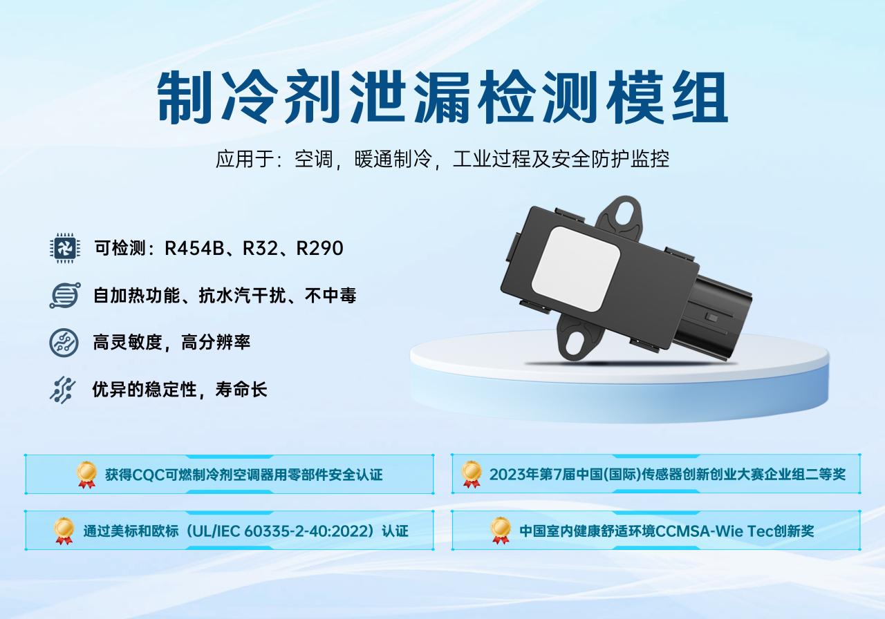 此次獲得的國際合作項目證書的ZRT510產品,是一款采用非分散紅外(NDIR)原理對制冷劑進行檢測的傳感器模組。模組采用多氣體補償算法,實現多氣體濃度檢測(R454B/R32/R290),并搭載溫度、濕度、壓力多維補償機制。為方便用戶應用,產品還可對結構件、硬件、軟件進行定制,實現不同項目需求。