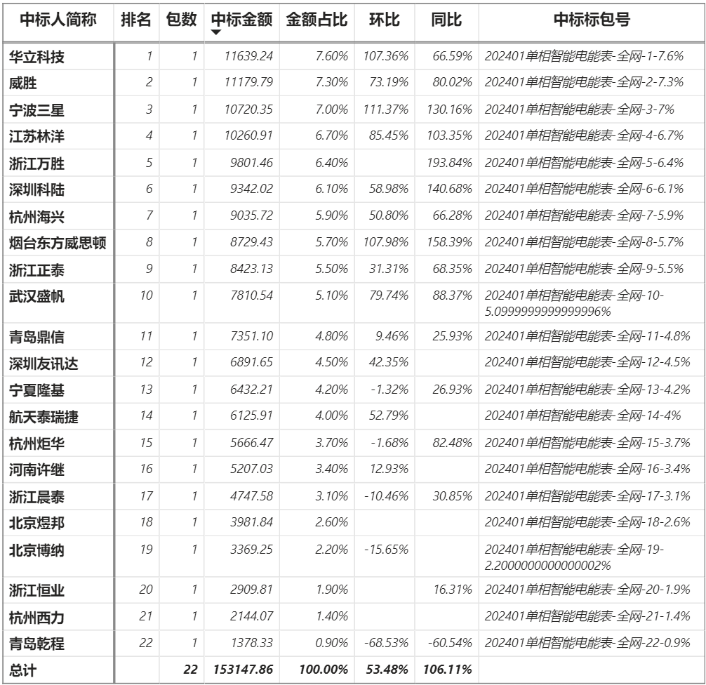 總金額15.31億元,22家企業(yè)實(shí)現(xiàn)中標(biāo),華立中標(biāo)最大包1.16億元;