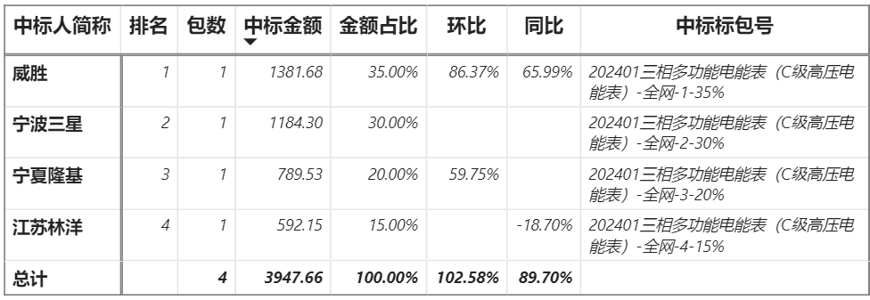 總金額3947.66萬(wàn)元,4家企業(yè)實(shí)現(xiàn)中標(biāo),威勝中標(biāo)最大包1381.68萬(wàn)元;