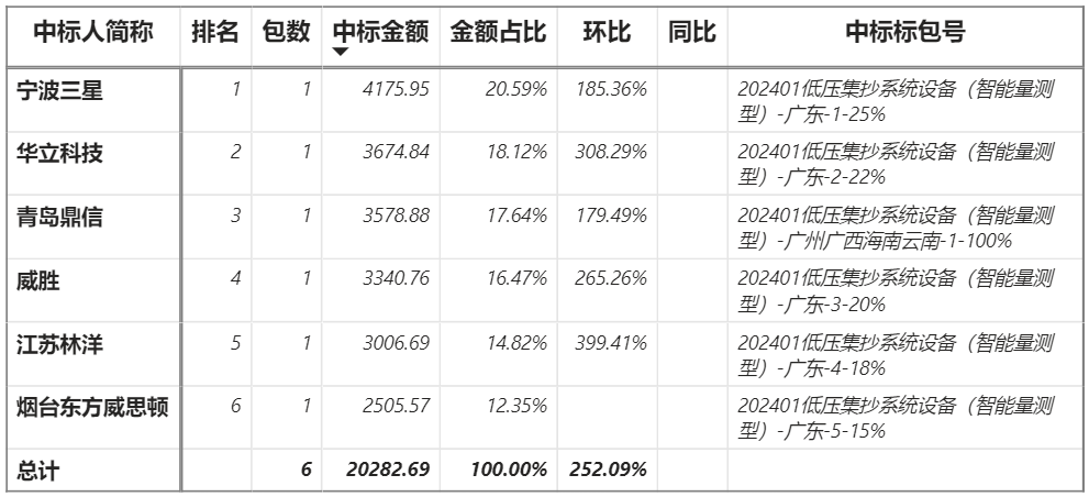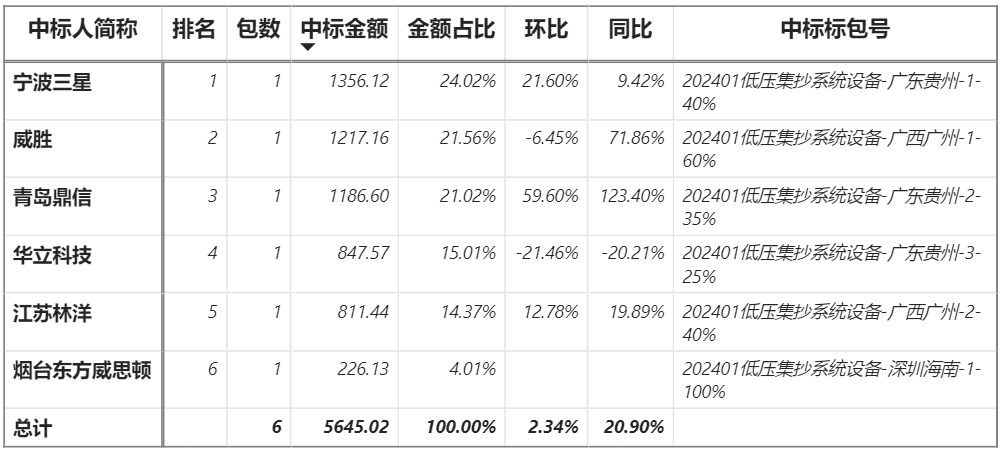 總金額2.03億元,6家企業(yè)實(shí)現(xiàn)中標(biāo),寧波三星中標(biāo)最大標(biāo)包4175.95萬(wàn)元;
