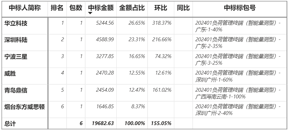 總金額1.97億元,6家企業(yè)實(shí)現(xiàn)中標(biāo),華立中標(biāo)最大包5244.56萬(wàn)元;