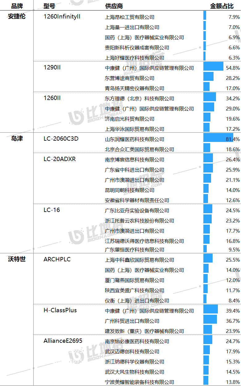 主要供應商及對應中標品牌包括:上海昂松工貿有限公司(安捷倫),上海中科鑫欣國際貿易有限公司(沃特世),山東潤耀醫藥科技有限公司(島津)等。