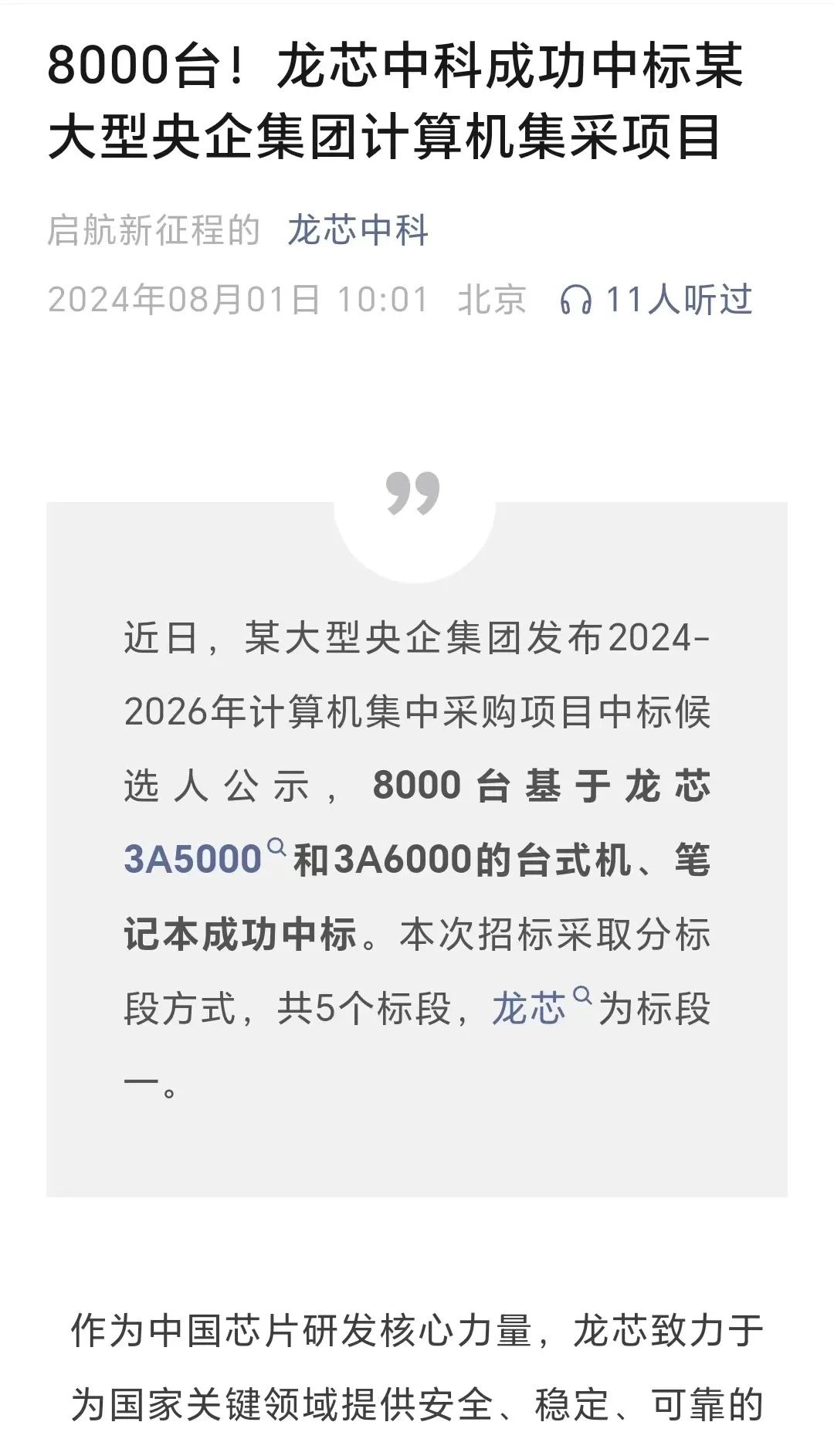 8月1日,龍芯中科在其官方微信公號(hào)中曾發(fā)文稱,近日,某大型央企集團(tuán)發(fā)布2024年-2026年計(jì)算機(jī)集中采購項(xiàng)目中標(biāo)候選人公示,8000臺(tái)基于龍芯3A5000和3A6000的臺(tái)式機(jī)、筆記本成功中標(biāo)。本次招標(biāo)采取分標(biāo)段方式,共5個(gè)標(biāo)段,龍芯為標(biāo)段一。