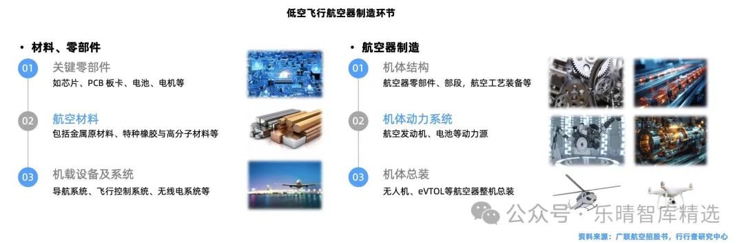 低空飛行航空器制造環節包括材料及零部件和航空器制造兩大關鍵部分。