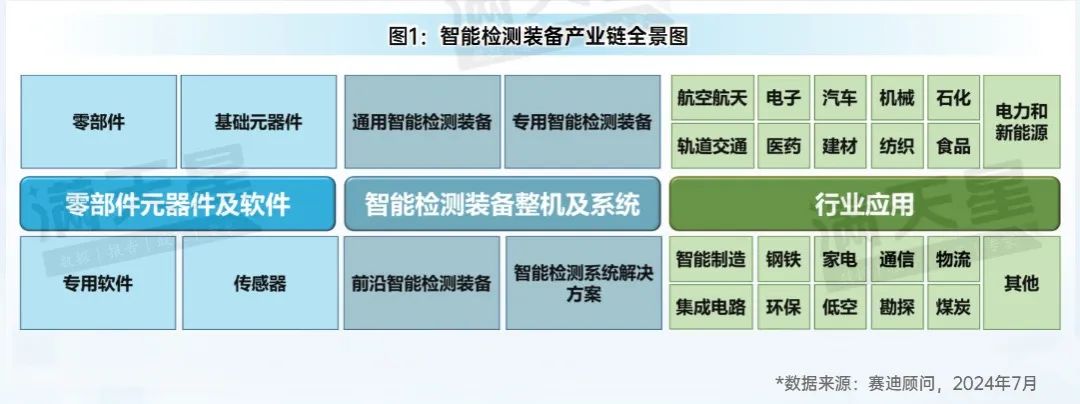 智能檢測裝備根據應用場景不同,可以分為通用智能檢測裝備、專用智能檢測裝備及前沿智能檢測裝備。通用智能檢測裝備適用于多個領域,專用智能檢測裝備多用于單一領域。智能檢測裝備產業鏈上游包括智能檢測裝備零部件、元器件及專用軟件等。智能檢測裝備廣泛應用于機械,汽車,航空航天,電子,鋼鐵,石化,紡織,醫藥等多個領域,是提高制造業水平、產品質量的關鍵環節。