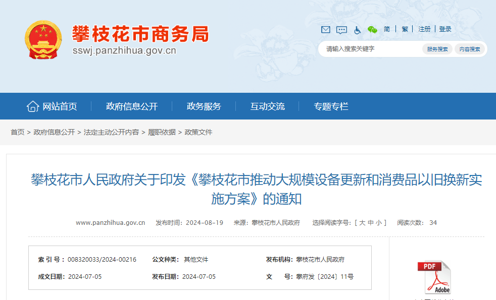 攀枝花市推動大規模設備更新和消費品以舊換新實施方案