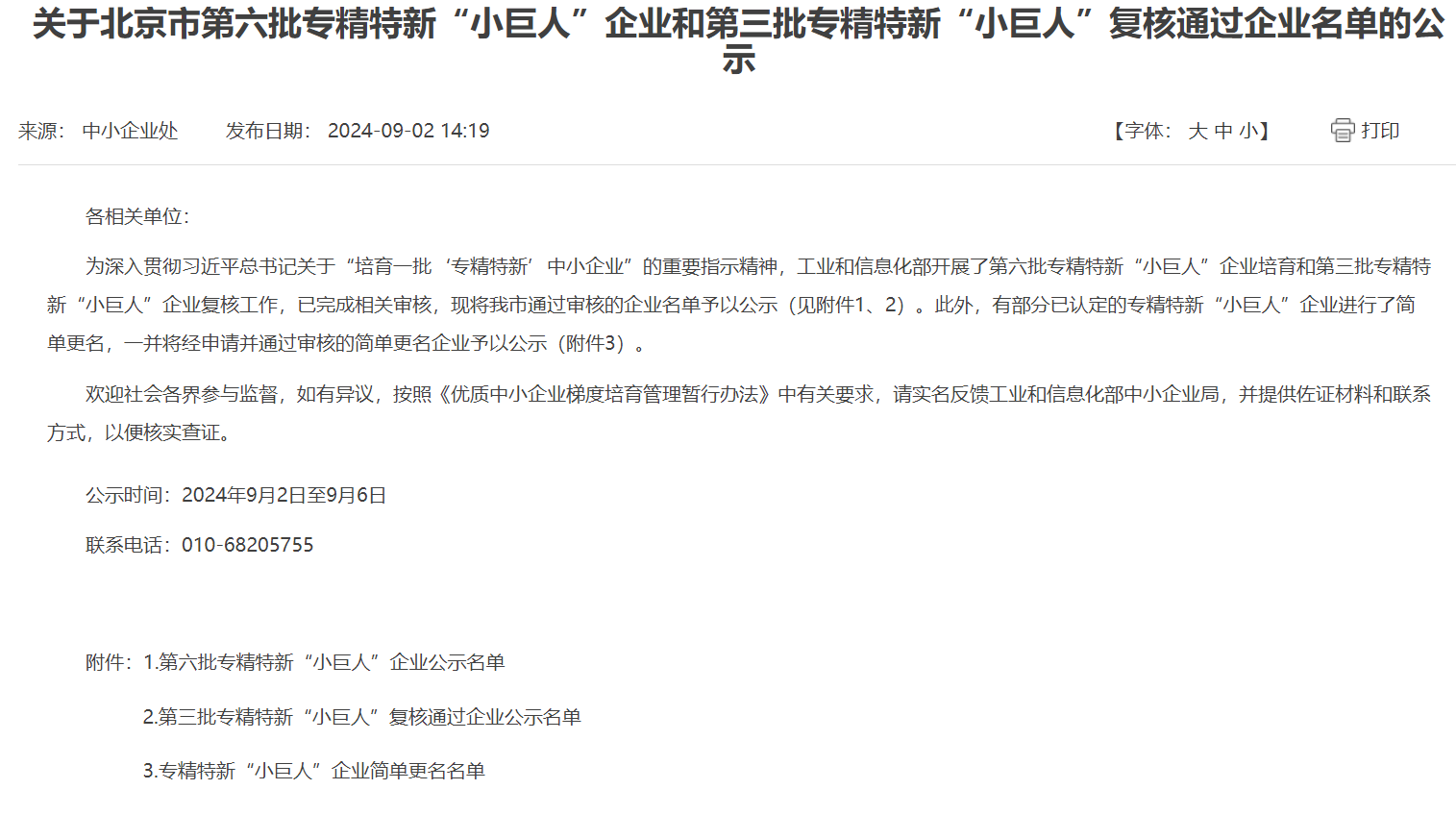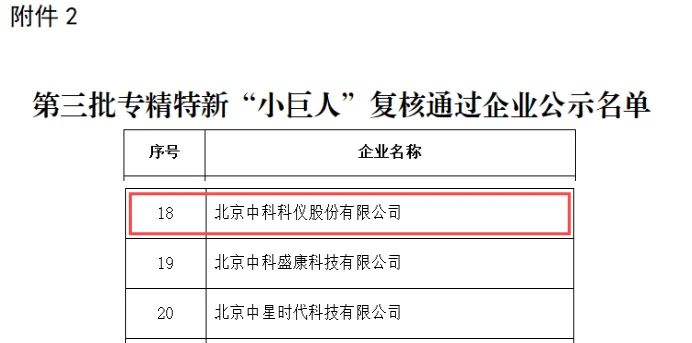 9月2日,北京市經濟和信息化局公示了第三批國家級專精特新“小巨人”復核通過企業名單,北京中科科儀股份有限公司通過工業和信息化部及北京市經濟和信息化局復核。