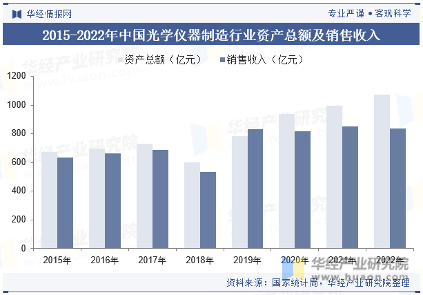 根據國家統計局數據,近年來我國光學儀器制造行業資產總額及銷售收入總體呈現出增長態勢,2015-2022年,行業資產總額由674.99億元增長至1072.58億元,CAGR為6.84%,行業銷售收入由632.65億元增長至835.72,CAGR為4.06%。