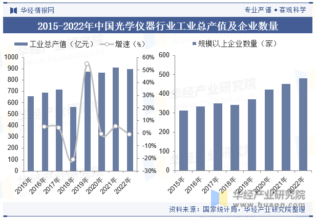 在電子技術和計算機行業發展的帶動下并伴隨著下游應用領域需求的日益增長,使得國內光學儀器制造行業市場規模持續擴張。據統計,2022年中國光學儀器制造行業工業總產值稍有下滑,為898.23億元,同比減少1.38%。我國光學儀器制造行業規模以上企業數量逐年攀升,2015年光學儀器制造行業規模以上企業數量為314家,2022年提升至482家。