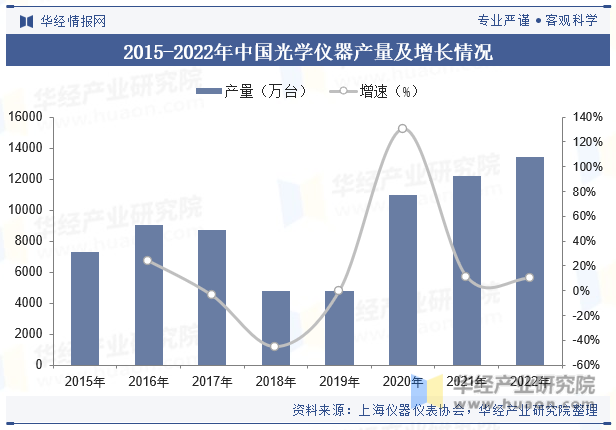 光學儀器是儀器儀表行業中非常重要的組成類別,從產量來看,近幾年國內光學儀器產量大幅增長,2020年中國光學儀器產量突破1億臺,同比增速達130.35%,2022年產量增長至1.35億臺,同比上漲10.05%。