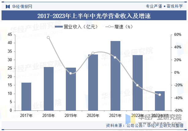 中光學集團成立于1991年,是中國光學儀器行業的領先企業之一。公司總部位于北京,擁有多個制造基地和研發中心,先后榮獲多項級獎項,是中國光學儀器行業的標志性企業。2022年受疫情反復、芯片短缺等綜合因素影響,營業收入下降至32.85億元,同比縮減20.44%,2023年上半年實現營收11.5億元,較2022年同比減少35.54%。