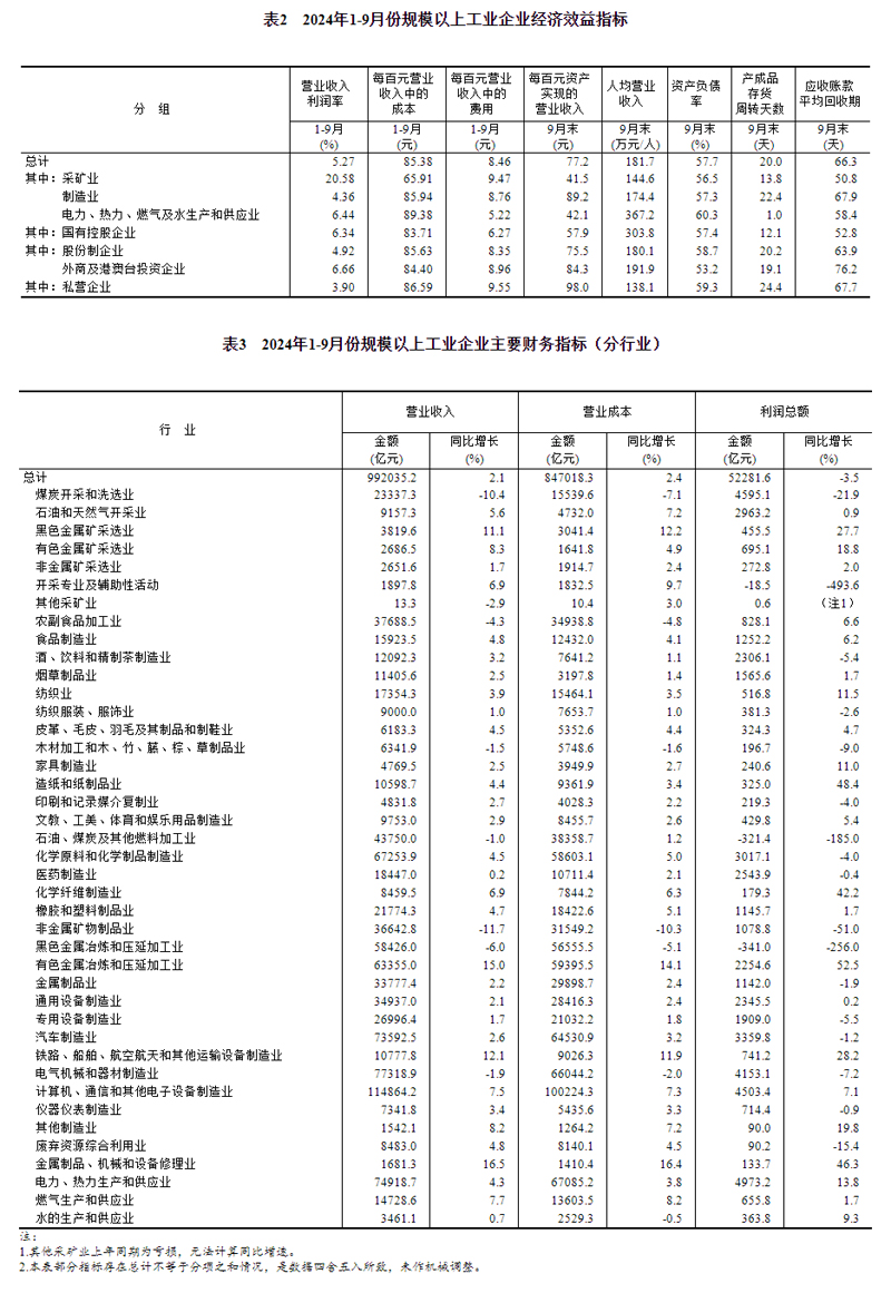 1—9月份,全國規模以上工業企業實現利潤總額52281.6億元,同比下降3.5%(按可比口徑計算,詳見附注二)。