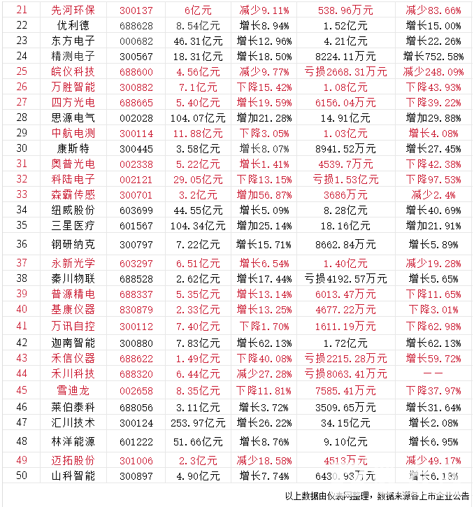 從虧損程度來看,50家企業中凈利潤出現虧損的有6家,分別為譜尼測試虧損2.34億元,同比減少322.2%;皖儀科技虧損2668.31萬元,同比減少248.09%;科陸電子虧損1.53億元,同比下降97.53%;秦川物聯虧損4192.57萬元,同比增長5.65%;禾信儀器虧損2215.28萬元,同比增長59.72%;禾川科技虧損8063.41萬元。