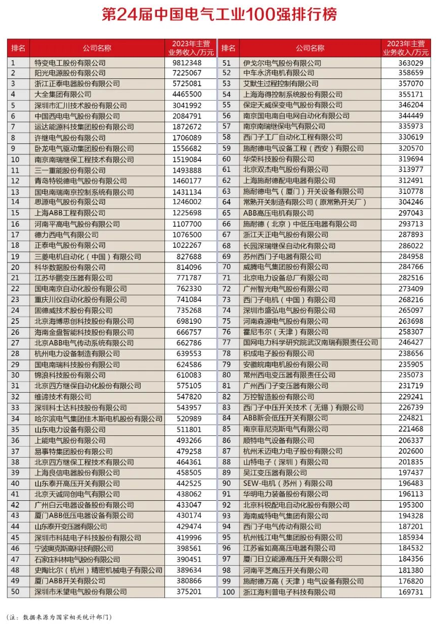 該榜單以2023年企業主營業務收入為基準,立足中國電氣裝備制造業,以第三方的角度根據國家相關統計部門的數據對電氣企業整體情況進行梳理。是研究中國電氣裝備制造業與電力電網、工業和基礎設施領域協調發展的重要參考。