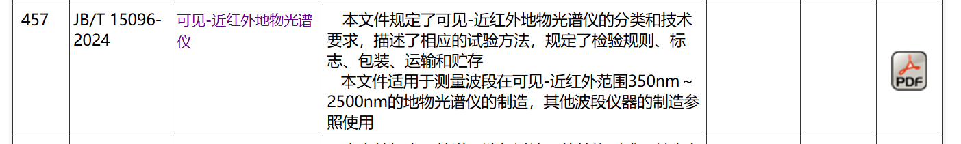 《可見-近紅外地物光譜儀》規定了可見-近紅外地物光譜儀的分類和技術要求。還對檢驗規則、標志、包裝、運輸和貯存等環節作出了詳細規定,為產品制造和質量控制提供了完整的指導體系。