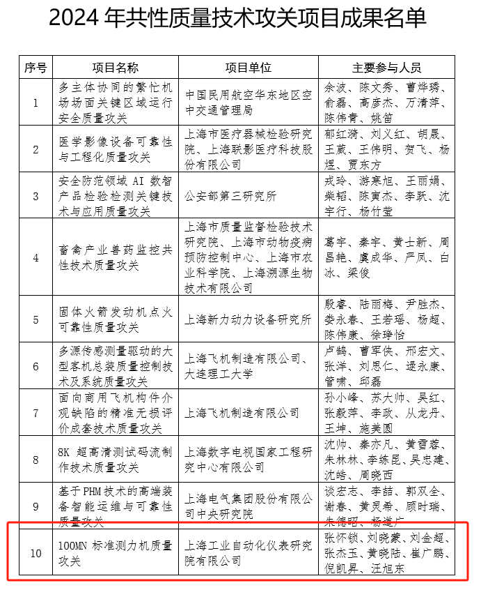 11月7日,上海市市場(chǎng)監(jiān)督管理局、上海市經(jīng)濟(jì)和信息化委員會(huì)發(fā)布《關(guān)于表?yè)P(yáng)2024 年上海市產(chǎn)業(yè)質(zhì)量攻關(guān)成果的通知》。上海工業(yè)自動(dòng)化儀表研究院有限公司(簡(jiǎn)稱自儀院)“100MN標(biāo)準(zhǔn)測(cè)力機(jī)質(zhì)量攻關(guān)” 項(xiàng)目脫穎而出,獲得2024共性質(zhì)量技術(shù)攻關(guān)項(xiàng)目成果獎(jiǎng)。
