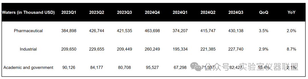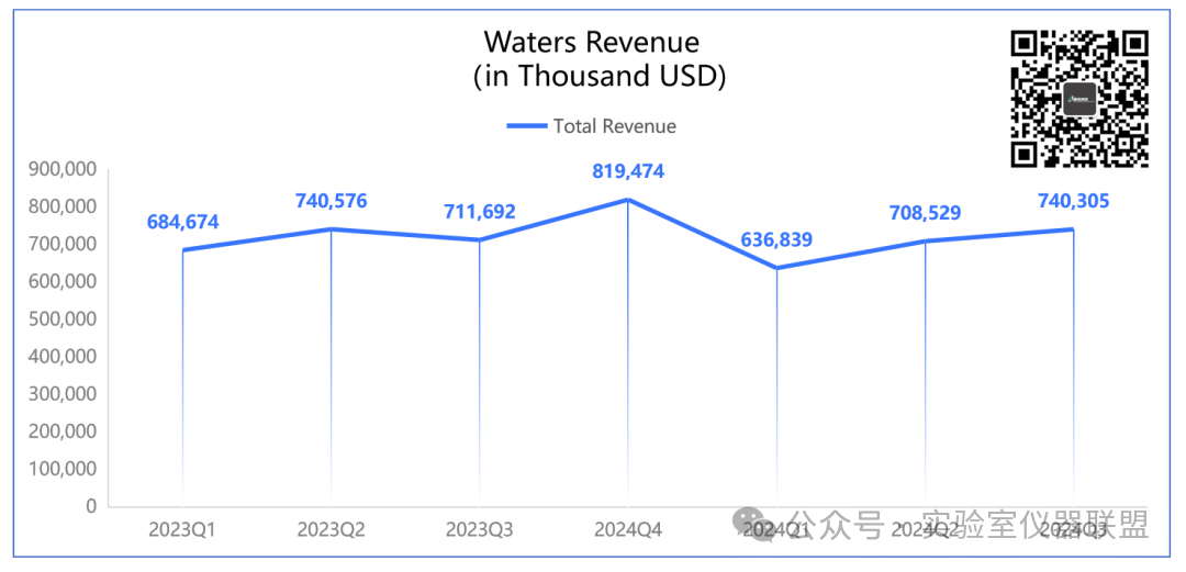 Waters2024Q3財報顯示,公司本季度營收7.40億美元,超過此前指引,同比增長4%。凈利潤1.615億美元,同比大增20%。值得注意的是,根據Waters財報,2024Q1/Q2期營收均同比下滑,尤其是Q1更是大幅下降。