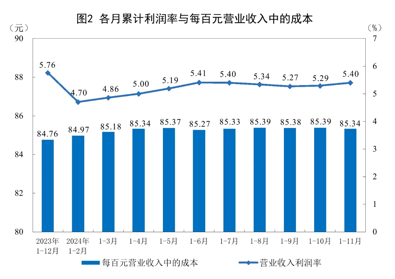 1—11月份,規(guī)模以上工業(yè)企業(yè)每百元營(yíng)業(yè)收入中的成本為85.34元,同比增加0.37元;每百元營(yíng)業(yè)收入中的費(fèi)用為8.40元,同比增加0.02元。