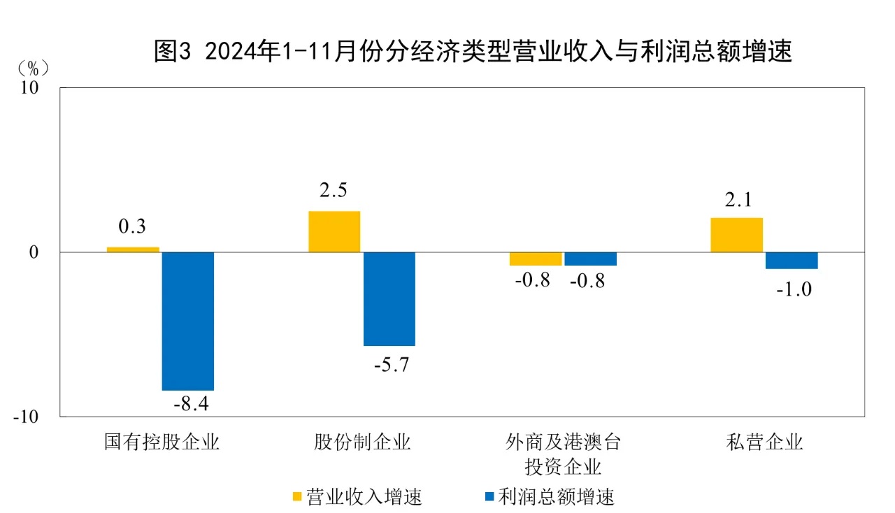 1—11月份,規(guī)模以上工業(yè)企業(yè)中,國(guó)有控股企業(yè)實(shí)現(xiàn)利潤(rùn)總額20387.7億元,同比下降8.4%;股份制企業(yè)實(shí)現(xiàn)利潤(rùn)總額50143.0億元,下降5.7%;外商及港澳臺(tái)投資企業(yè)實(shí)現(xiàn)利潤(rùn)總額16062.9億元,下降0.8%;私營(yíng)企業(yè)實(shí)現(xiàn)利潤(rùn)總額19649.1億元,下降1.0%。