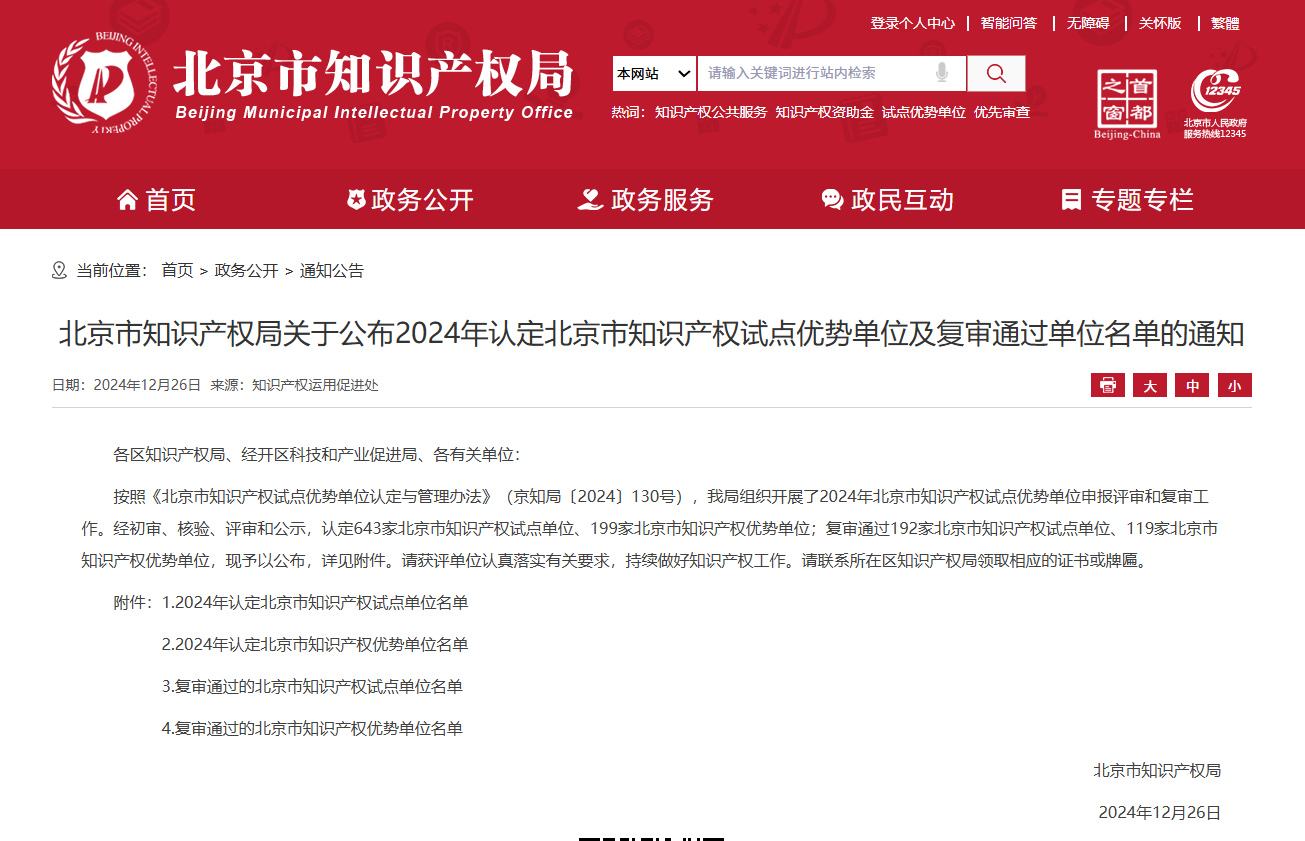 2024年12月26日,北京市知識產權局發布《關于公布2024年認定北京市知識產權試點優勢單位及復審通過單位名單的通知》。經過嚴格初審、核驗和評審程序,北京康吉森自動化技術股份有限公司(以下簡稱“康吉森股份”)以卓越的科技研發實力、顯著的成果轉化能力以及完善的知識產權管理體系,成功被認定為“北京市知識產權試點單位”。