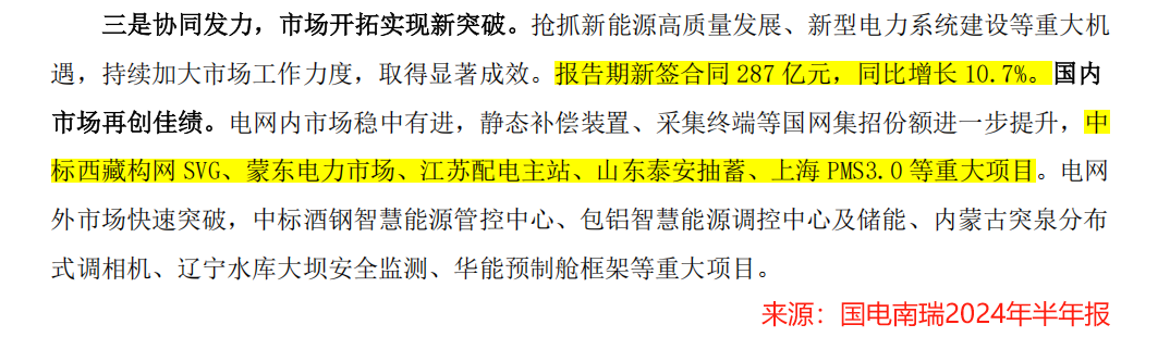 2024年上半年,國電南瑞新簽合同287億,同比增長10.7%,并且中標了蒙東電力市場、江蘇配電主站、山東泰安抽蓄等重大項目。