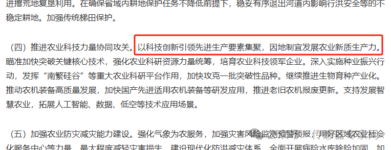 尤其值得關(guān)注的是,本次中央一號文件首次提出“農(nóng)業(yè)新質(zhì)生產(chǎn)力”概念,明確要推進(jìn)農(nóng)業(yè)科技力量協(xié)同攻關(guān):