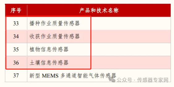 《目錄》儀器儀表領(lǐng)域中,基礎(chǔ)零部件和元器件共計(jì)37種,其中傳感器20種,有4種農(nóng)業(yè)傳感器被“點(diǎn)名”列入,分別是:播種作業(yè)資料傳感器、收獲作業(yè)資料傳感器、植物信息傳感器、土壤信息傳感器。