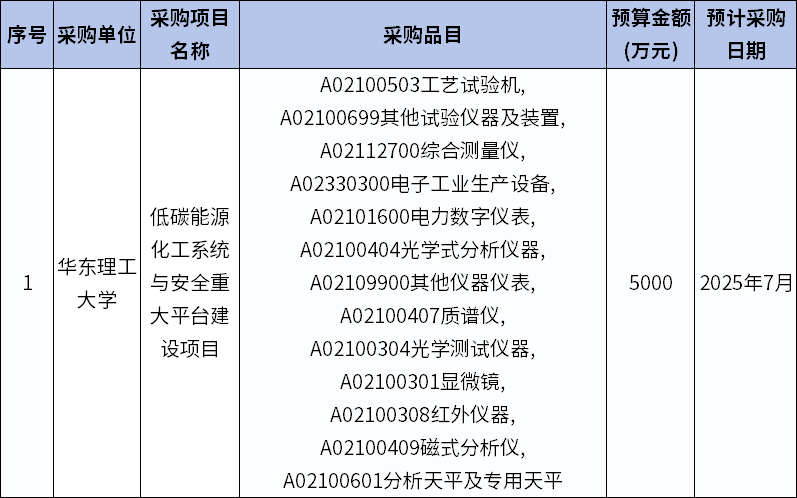 為便于供應商及時了解政府采購信息,根據《財政部關于開展政府采購意向公開工作的通知》(財庫〔2020〕10號)等有關規定,現將華東理工大學2025年7至12月政府采購意向公開如下: