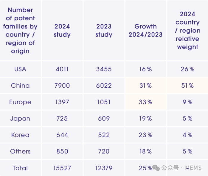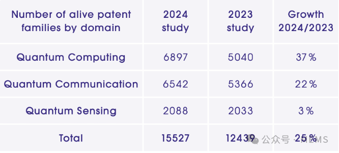 2024年,量子計算和量子通信領(lǐng)域的專利族占比明顯高于量子傳感,三者的占比分別為44%、42%和14%。從2023年~2024年的增長率來看,量子計算和量子通信領(lǐng)域的專利增長也顯著高于量子傳感領(lǐng)域,三者的增長率分別為37%、22%和3%。反映了當(dāng)前全球量子技術(shù)領(lǐng)域的發(fā)展熱點和重點方向。