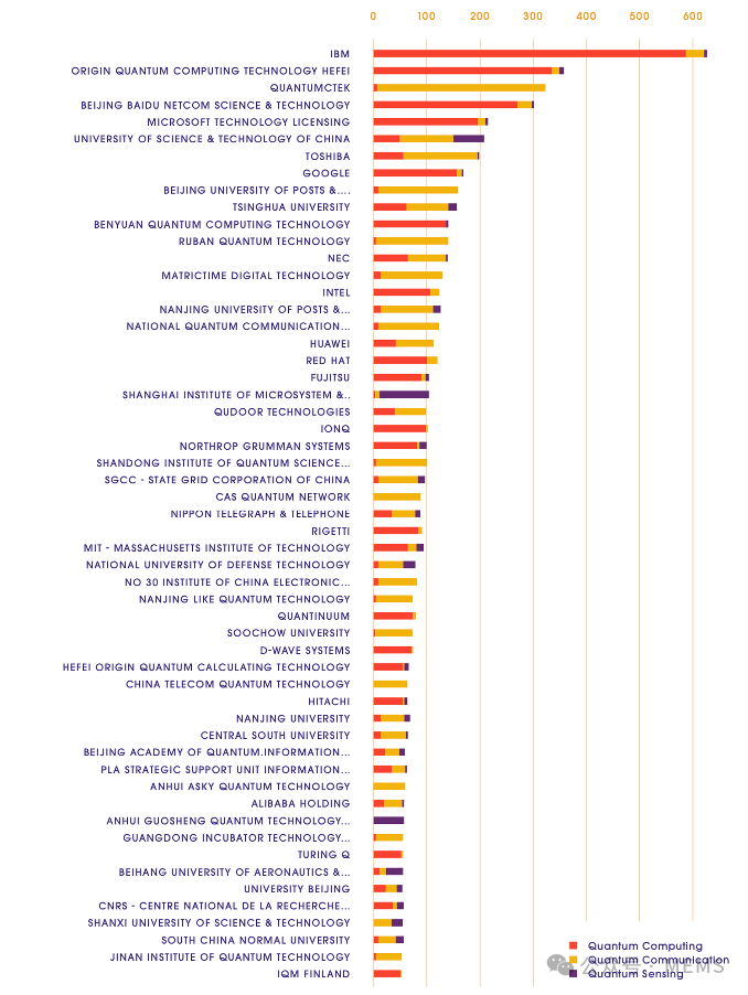 按技術(shù)類型細(xì)分,來自中國排名前三的機(jī)構(gòu),本源量子計算科技(合肥)股份有限公司和北京百度網(wǎng)訊科技有限公司主要聚焦量子計算技術(shù),科大國盾量子技術(shù)股份有限公司則主要聚焦量子通信技術(shù)。在量子傳感技術(shù)領(lǐng)域有大量專利布局的中國機(jī)構(gòu)有:中國科學(xué)技術(shù)大學(xué)、中國科學(xué)院上海微系統(tǒng)與信息技術(shù)研究所、安徽省國盛量子科技有限公司以及北京航空航天大學(xué)等。