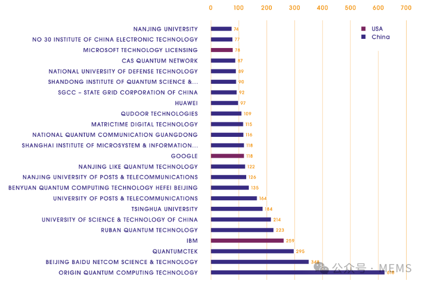 在中國申請的量子技術(shù)專利按申請量排名,前25位專利申請人中,除了三家來自美國的申請人(IBM、谷歌和微軟),其他全部為中國本土機(jī)構(gòu),包括本源量子計算科技(合肥)股份有限公司、北京百度網(wǎng)訊科技有限公司、科大國盾量子技術(shù)股份有限公司、如班量子科技有限公司、中國科學(xué)技術(shù)大學(xué)、清華大學(xué)、北京郵電大學(xué)及南京郵電大學(xué)等。
